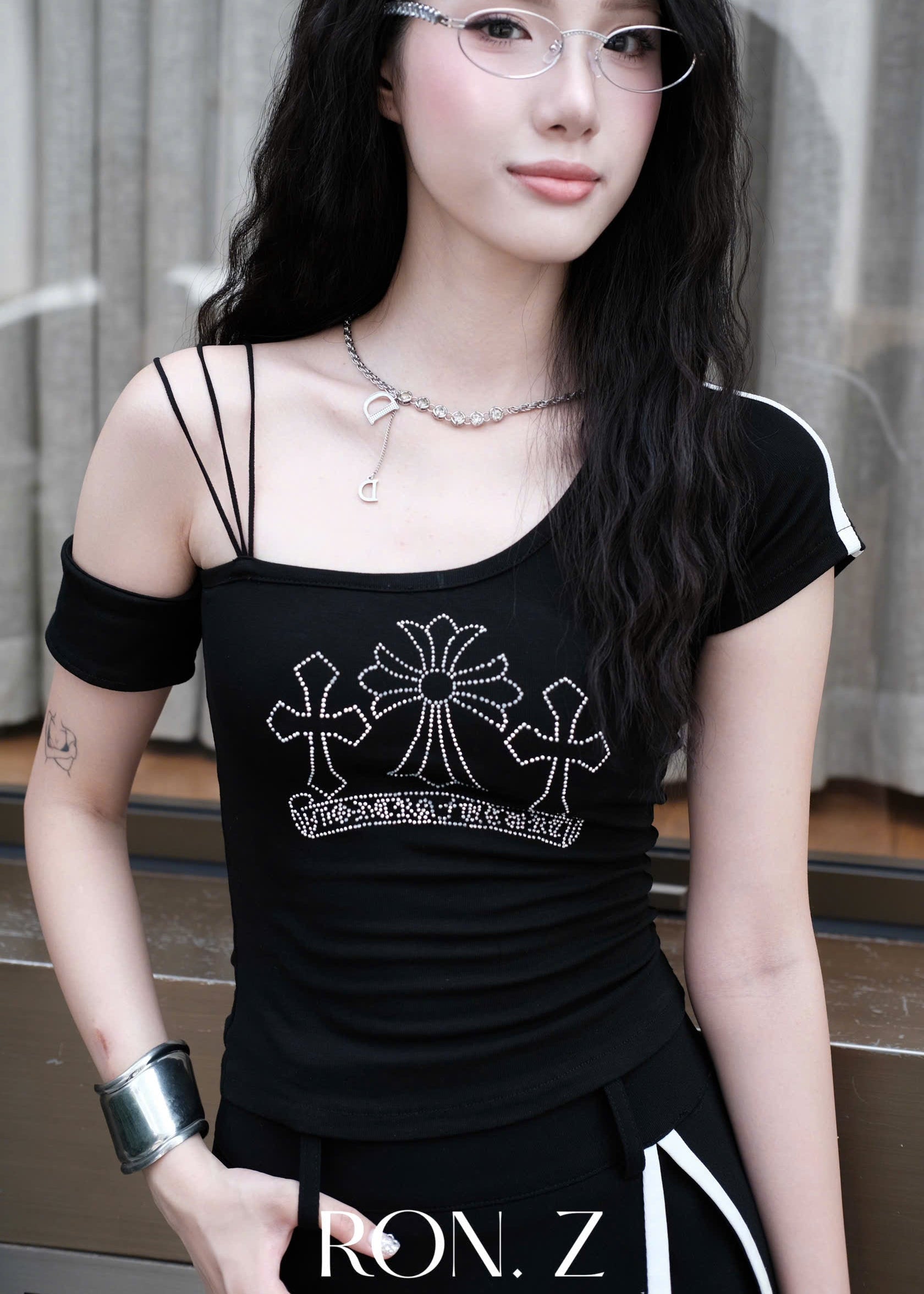 RON - Embellished One-Shoulder Top
